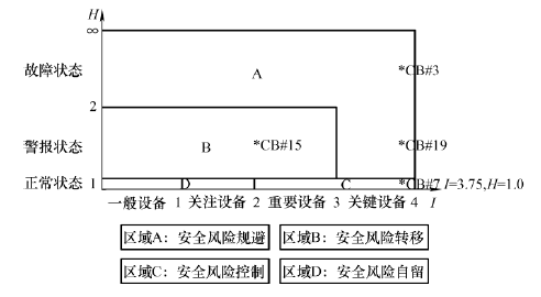 四台断路器评估结果如图8 所示。CB#3和CB#19重要度非常高且运行状态很差,处于不安全不可靠的运行状态,需要进行安全风险规避。CB#15处于异常运行状态且重要度较高,应该采取安全风险转移。CB#7处于安全的运行状态,但其重要度很高,要加强注意。根据管控措施指标按照CB#3,CB#19,CB#15,CB#7的先后顺序进行管控。