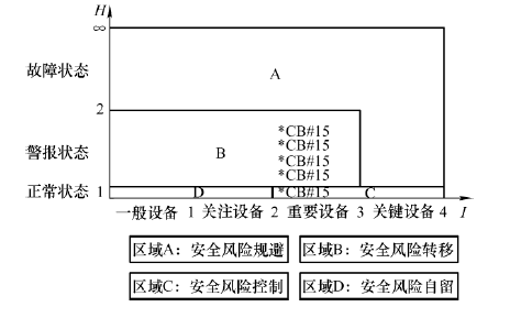 纵轴数值从1~∞,H =1时表示设备处于正常运行状态;H =1~2时表示设备处于警报运行状态;H =2~∞时表示设备处于故障运行状态。横轴数值I =0~1时表示设备为一般设备;I =1~2时表示设备为关注设备;I =2~3时表示设备为重要设备;I =3~4时表示设备为关键设备。基于当前的风险评估结果,可判别系统的实时风险并实施措施。