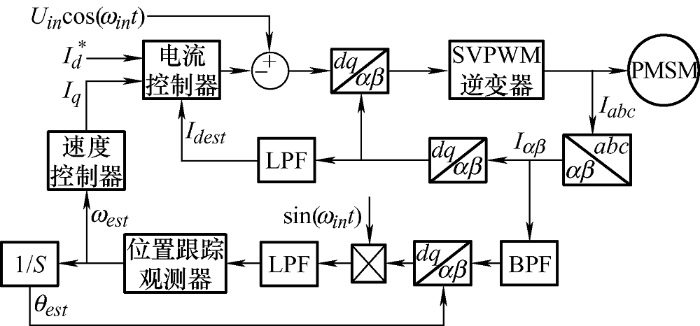 在电机起动过程中,由于电机运行速度较低,反电势小,若利用反电势法来估计转子位置信息,角度位置估算不准确。所以利用转子凸极性进行角度位置跟踪。这种方法主要是通过向控制系统中注入高频信号,电机会响应出与转子位置信息相关的信号,对此信号进行解调,便能够得出相应的角度位置,本文以脉振高频信号注入法[11 ] 为例,对此方法的原理进行分析,整体控制框图如图1 所示。