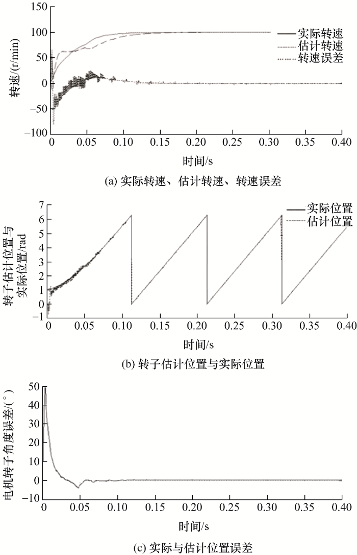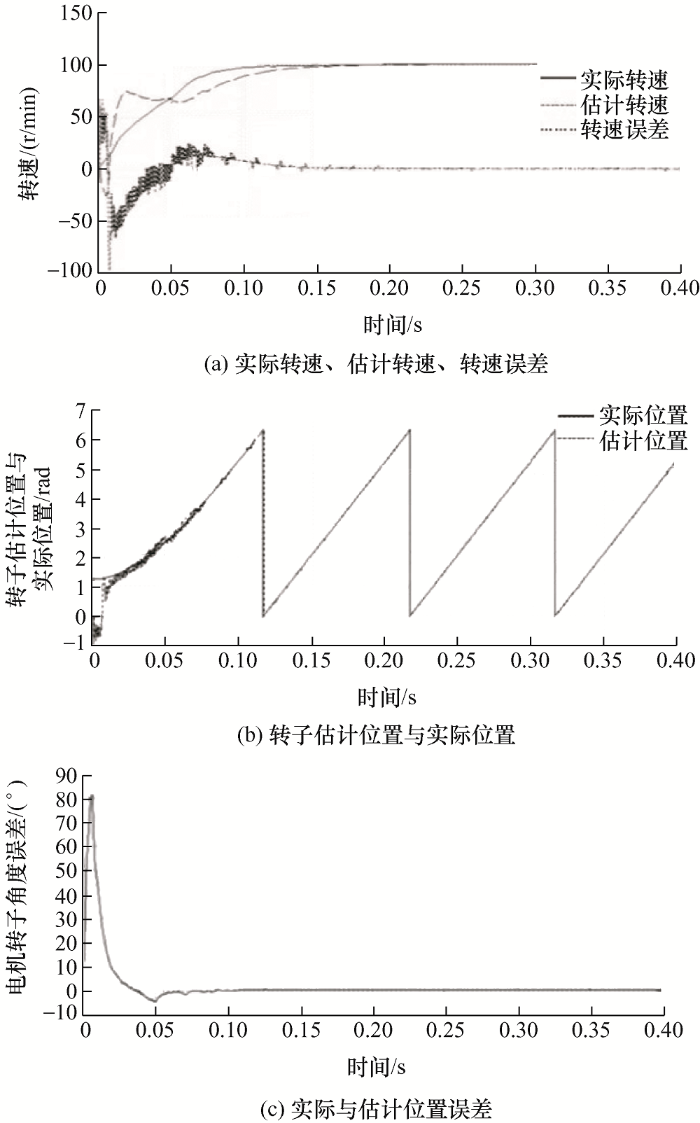 其中,初始角度为90°时得到的检测结果分别如图17 a、17b、17c所示。仿真结果表明,当电机初始电角度为90°时,转速约在t =0.17 s时达到稳定,电机约在t =0.08 s跟踪上转子的实际位置,稳态时转子误差约为0.5°。