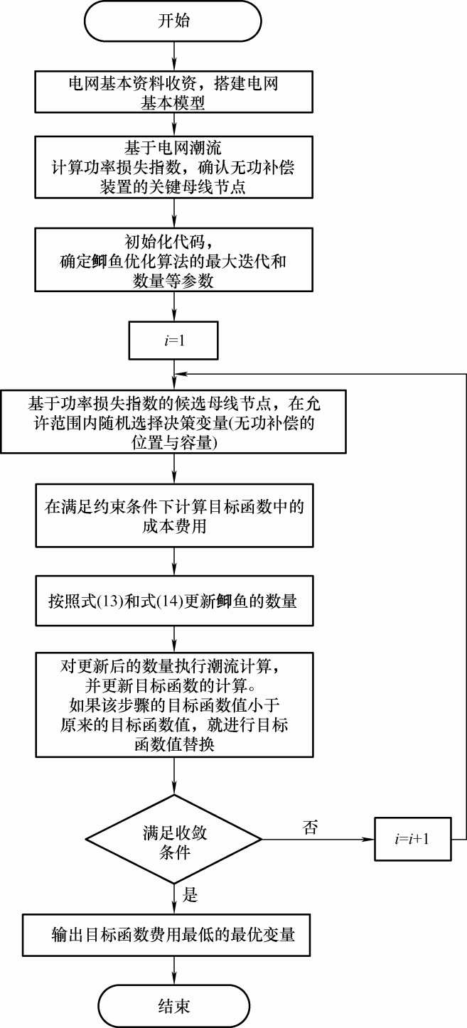 无功补偿装置配置优化问题所考虑的重点是目标函数的构建和优化求解方法的设计。文献[12]采用了改进粒子群算法,对考虑系统电压偏移总量与有功损耗最小的无功优化问题进行求解,但未考虑装置的成本。文献[13]基于和声搜索算法实现配网电容器的多目标优化配置,从而在降低网损的同时最小化无功补偿费用。文献[14]引入反向学习对鸡群算法进行改进,从而提升了配电网无功优化模型的整体性能,但该方法耗时较长。文献[15]采用粒子群算法求解城市配电网无功优化配置问题,模型目标函数为运行成本的期望值最小,但未开展安装节点的选取,同时求解耗时较长。文献[16]提出了鲸鱼优化算法对以有功损耗最小为目标的无功配置优化问题进行求解,但目标函数较为单一,易于陷入局部最优。此外未综合考虑关键节点的优先选择。文献[17]将布谷鸟算法中的飞行和淘汰机制引入粒子群算法,对以有功损耗最小为目标的无功优化配置问题进行求解,但目标函数过于单一,所得结果不完全符合配电网实际运行。文献[18]考虑含分布式电源的接入,提出了基于模糊聚类下的混沌优化人工鱼群算法,对以网损最小为目标的无功优化配置问题进行建模求解。文献[19]利用改进教与学算法,实现以有功网损和电压偏离度最小为综合目标的无功优化配置。