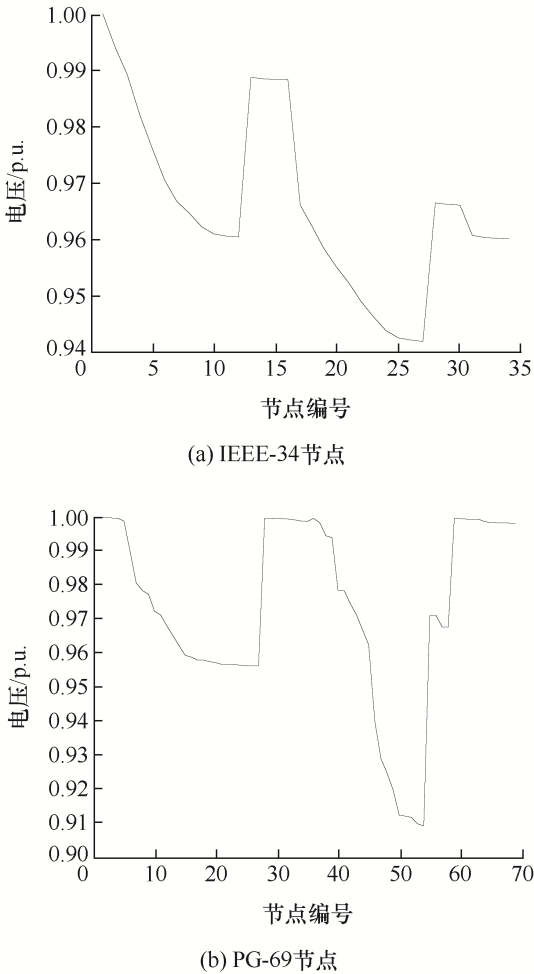 由表3可知,对IEEE-34/PG-69节点系统,方法1所得有功损耗较(方法2、方法3)分别减小了(0.34%、1.15%)/(0.72%、0.55%),最小电压值提升了(0.22%、0.22%)/(0.39%、0.32%)。