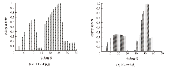 由图13可知,DG的接入将对配电网系统的功率损失指数产生一定影响,2个DG接入下的功率损失指数略小于1个DG接入下的情况,但关键节点保持不变:对IEEE-34节点系统为26、25、24、23、22、21、20,对PG-69节点系统为54、53、52、51、50、49、48。