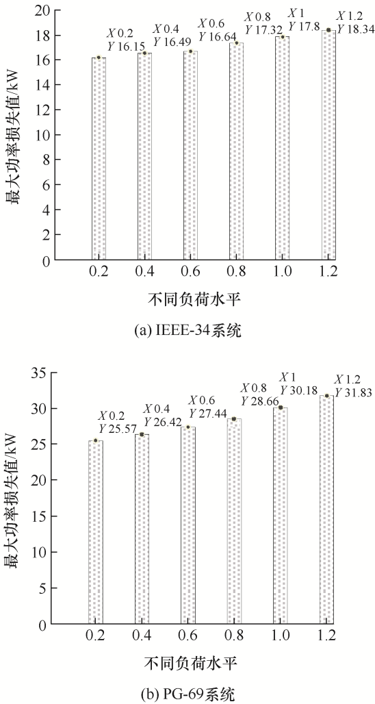 为进一步研究不同负荷条件下本文算法性能,将IEEE-34和PG-69节点系统的有功负荷乘以相应系数以模拟不同负荷条件。图12给出了不同负荷条件下Pl (j)的最大值。