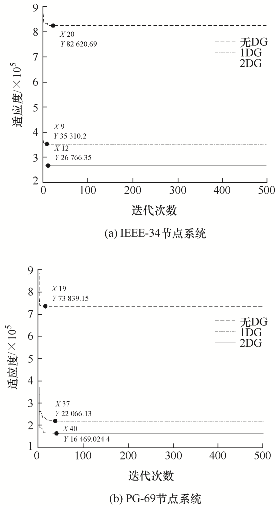 如表6所示,在已有DG接入时IEEE-34/PG-69节点系统所需无功配置容量均减少,且DG接入越多无功配置容量可降低更多,最大可达51.02%/60.95%;接入(1个、2个)DG时,两个配电网有功损耗值减少达(63.90%、71.49%)/(69.45%、77.65%),相应成本费用减少(57.62%、67.60%)/ (70.11%、77.69%),最小电压分别从0.950 7 p.u./ 0.932 3 p.u.升至(0.976 1 p.u.、0.982 5 p.u.)/ (0.969 7 p.u.、0.985 2 p.u.)。