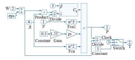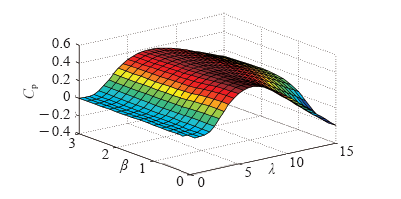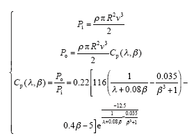 式中,Pi为风力机输入功率;Po为风力机输出功率;Cp为风能利用系数;v为实际风速;β为是叶片与旋转平面的夹角;λ为叶尖速比,即圆周速度与风机接触叶片之前很远距离上的速度之比。