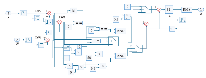 同理可得区域C的点3和点4处的功率变化量见式(3)。但当分母角速度的变化量接近于零时,式(3)没有意义,为保证功率跟踪的准确性,减小最大功率点的波动,若下一时刻跟踪的功率变化量的绝对值大于域值ε,搜索步长按照式(4)进行。本实验中取搜索域值ε为50,仿真模型如图7所示。