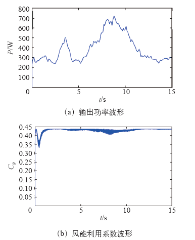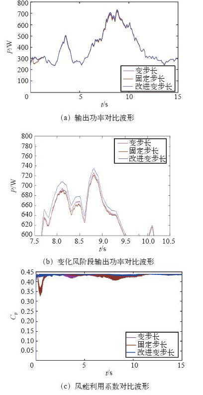 图16波形曲线表明,输出功率曲线中(见图16a),曲线的变化趋势与图3模拟的风速曲线接近,验证了式(2)中的输出功率与真实风速的关系。在主动扰动开始阶段即0~2.5s的平均风风速段和湍流风风速段,变步长爬山搜索算法的输出功率比定步长的平稳准确,波动小,但在整个功率搜索的过程中,优化的变步长爬山搜索算法的搜索效果最好,它不仅保证了在0~2.5s的平均风风速段和湍流风风速段输出功率的准确跟踪,适用于风速变化较频繁的系统。而且,在2.5~4.5s的阵风阶段,风能利用系数的平均值最大,输出功率损失最少。在5~12s的变化风阶段,输出功率对比波形如图16b所示,由图可知优化的变步长MPPT算法的输出功率损失最少,且由风能利用系数波形可知,这段时间内的风能利用系数也最大。所以,从整体上来看,优化的变步长MPPT算法的输出功率跟踪效果最好,且在主动扰动开始阶段就能跟踪上最大功率点,波动小,风能利用系数也比以上两种更能够实时跟踪最大值,风能利用率最大。