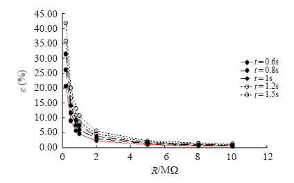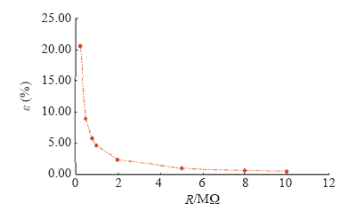 按标准要求在合闸后第3个周期的波峰处记录电压误差,通过多次仿真得到电阻R的值与电压误差ε(%)的关系如图7所示。