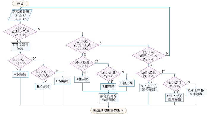 开关器件故障导致的续电流和相电流变化,通过逻辑判断可判别故障类型并实现故障器件定位,逻辑判断如图4所示。为了控制器依据诊断参数可以准确判断出故障类型和故障器件,设置3个判断阀值K1、K2和K3(K2>K1>K3)。K1用于检测开路的故障相;K2用于检测下开关器件短路的故障相;而K3用于检测上开关器件的短路故障。根据发电功率、诊断算法选取阀值,经过反复实验,本算法经验值公式为