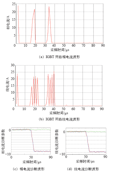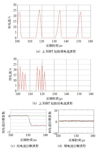 上位机监控软件检测到诊断参数的绝对值超过检测阀值K3 = 3,故障特征明显,如图10d所示。由诊断软件可知,A相上开关器件发生短路故障。