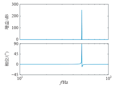取kp = 1,kr = 1可以得到理想PR控制器的波特图,如图4所示。
