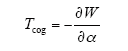 齿槽转矩是永磁电机绕组不通电时永磁体和铁心之间相互作用产生的转矩,是由于永磁体与电枢齿之间作用力的切向分量引起的,当永磁电机的定、转子存在相互运动时,在一极永磁体两侧面对应的电枢齿所构成的一小段区域内,磁导发生显著变化,引起磁场储能变化,从而产生齿槽转矩。从齿槽转矩定义来看,即为气隙磁场的储能对定转子位置角的负导数,如下式所示