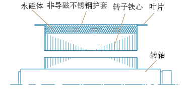 使用非导磁不锈钢护套能可靠保证电机在高温高速的工作条件下,永磁体不会从铁心上脱落飞溅,保证电机使用安全;而且因为其表面光滑、均匀,也减少了风摩损耗。图5为带护套转子结构图,护套和永磁体之间采用过盈配合,以抵消高速旋转时离心力产生的拉应力,并保证永磁体在转子高速旋转时始终承受适当的压应力。