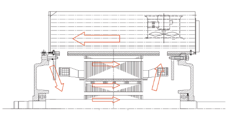 电机内部风路由冷却器外鼓风机和转子压板侧的径向式叶片提供风压,为了更加有效地给定子铁心散热,在定子铁心轭部开有圆周均布的通风孔槽,在保证足够通风面积的情况下,铁心轭部所开的孔不致使轭部磁密过高。风路流经转子铁心时,即能有效冷却定子绕组端部。转子铁心处同样开有通风孔槽,和气隙、定子通风孔槽形成3个并联风路。在定子铁心两端的机座处安装有挡风板,以减少风路风阻[16]。