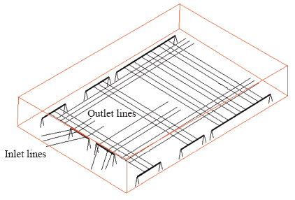 Because of the complexity of the switch yard in the substation. When modeling the distribution of power frequency electric field to calculate its switching field, we make the following simplifying processing: regarding the bus, inlet and outlet lines as linear type wire, potential equal to the wire of voltage, set the ground to be zero potential. The relevant model parameters are set as follow: the height of in-line is 30m, spaced 8m, line height is 26m, spaced 7.5m, 1M, 2M bus modeling height is 16.2m, distance 100m, during normal operation the phase voltage is 303.12kV. The simplified model is shown in Fig.3.