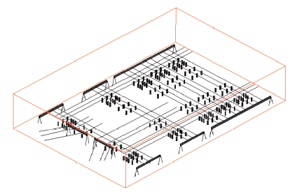 Due to complex of electrical equipment, the structure of the model should be simplified when modeled, the influence of all kinds of metal earth electrodes in the switchyard on the surrounding electric field mainly is considered. The parameters are set to: the potential of the grounding body is set to 0, the radius of the earth electrodes is set to 0.13m, the metal earth electrodes of the different electrical equipment with different heights (the hight of post insulator is 5.1m, isolating switch is 5.1m, circuit breaker is 4m, grounding switch is 5.1m and transformer is 3.2m). After considering the metal earth electrode the model of 500kV switchyard is shown in Fig.7.
