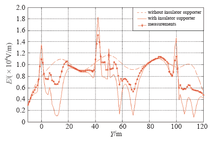 In order to further study the effect that the earth electrodes of all kinds of electric equipment have an effect on the distribution of power frequency electric field in the switchyard, the electric field of power frequency under the C phase of the first incoming line (the position marked by the vertical dashed lines in Fig.2) were calculated, and the calculation results are shown in Fig.10.