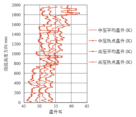 | 高压绕组平均温升/K | 49.7 | 50.0 | -0.6 |