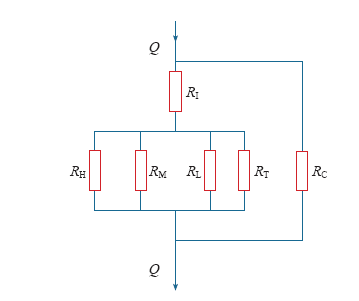 图5中,RH是高压绕组油路阻力,RM是中压绕组油路阻力,RL是低压绕组油路阻力,RT是调压绕组油路阻力,Rc是铁心油路阻力,RI是油箱、器身公共油路阻力,Q是油流量。