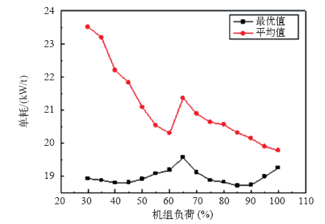 为更直观地对比动态规划法分配方案与平均分配方案之间的电耗差异情况,将两种方案电耗标注在同一坐标系进行分析,如图3所示,对比可知,采用动态规划法分配负荷制粉系统电耗大幅度降低。