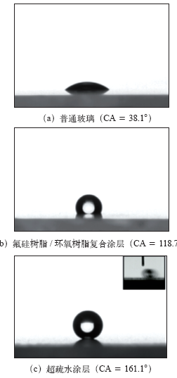水滴在普通玻璃、氟硅树脂/环氧树脂复合涂层和超疏水涂层的静态接触角图像