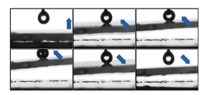 图2为水滴接触超疏水涂层表面的动态组图。将超疏水涂层反复接触该水滴,无论怎样挤压水滴,水滴始终没有粘结在超疏水涂层上,表明水滴在涂层表面具有很低的粘附力。低粘附力使得水滴不容易粘附在涂层上,有助于提高涂层的防冰性能。