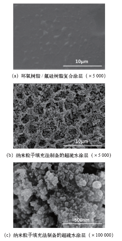 环氧树脂/氟硅树脂复合涂层和纳米粒子填充法制备的超疏水涂层的扫描电子显微镜图片