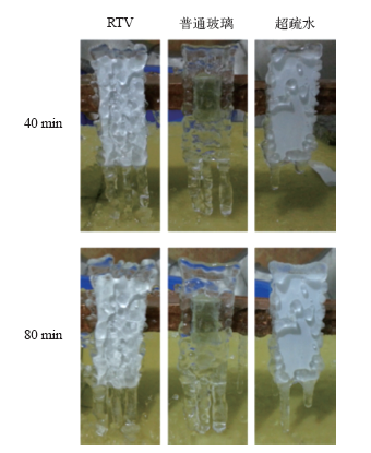 图5 室温硫化硅橡胶涂覆载玻片、空白载玻片、超疏水载玻片在雨凇条件下覆冰40min和80min形貌图 |