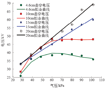 Fig.7 Fitting curves of breakdown voltage to air pressure |