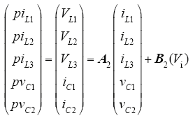 模式2:开关管关断时,电源和电感L1、L3共同为电容C1充电,电感L2为电容C2充电,式(5)和式(6)列了模式2下状态空间方程