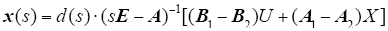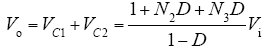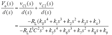 因本文欲通过小信号模型完成对变换器的闭环控制,只需求出该模型下电路输出变量vC1(s)、vC2(s)对控制变量d(s)的传递函数即可。为简化计算量,令N2 = N3 = N,C1 = C2 = C,L2 = L3 = N2L,忽略上式中与控制变量无关的部分并带入相关变量矩阵得到输出量对控制量的小信号传递函数