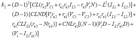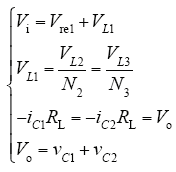 在该变换器中,反激变压器及耦合电感作为主要储能元件在整个电路工作过程中起到重要作用,电感L1、L2、L3的寄生电阻对电路内部电压及电流变化产生很大影响,因此在模型建立过程中加入反激变压器一、二次侧电感及耦合电感寄生电阻re1、re2、re3。设与系统中储能元件对应的电感电流iL1、iL2、iL3,电容电压vC1、vC2为系统状态变量,输入电压Vi及电路占空比D作为系统的输入信号。