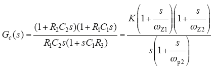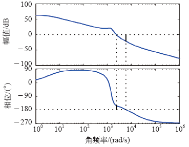 式(15)为网络补偿器传递函数,该补偿网络可在低频区提供一个积分环节以减少输出响应的调节时间,在中高频段滞后部分增加系统相位裕度,超前部分可使截止频率点右移来改善系统幅值裕度。