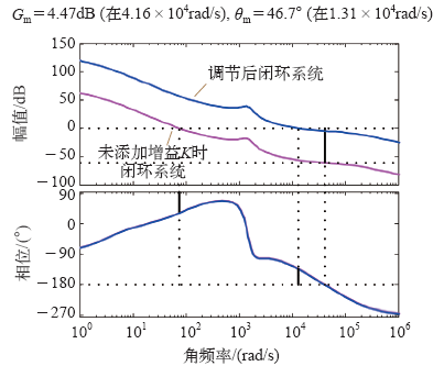 图7中红线为调节后闭环系统伯德图,调节后伯德图相位裕度r = 46.7°>45°,截止频率ωc = 1.31×104rad/s与期望值基本一致,幅值裕度A(ω) = 4.47dB,满足系统静态和动态特性的要求。