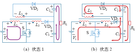 状态1:如图3a所示,开关管S导通时,电源为反激变压器一次侧充电,形成回路Vi-L1-S。反激变压器二次侧电感的感应电动势与L1电位相反,耦合电感与L1电位相同,二极管VD1、VD2反向偏置,反激变压器及耦合电感处于储能阶段,在t1时段末电感电流充电达到峰值,与此同时,输出电容C1、C2给负载RL提供能量。