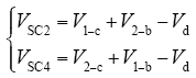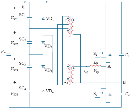 半桥变换器的开关S1和S2以接近50% 的占空比互补导通,超级电容器的端电压分别为VSC1、VSC2、VSC3和VSC4,二极管压降为 Vd,由图2可得变压器一次绕组电压为