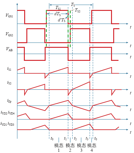 模态2(t1~t2)(图4b):开关S1关断,变压器漏感Lp中的电流iLp经过开关S2中的反并联二极管续流,S2ZVS导通,且二极管VD2和VD4持续导通,电流iLp下降,流过二极管VD2和VD4的电流iVD2、iVD4下降。