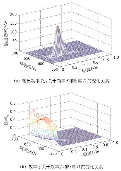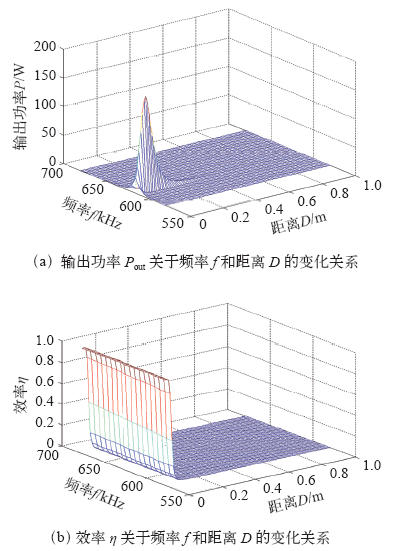 拓扑结构一一进行仿真分析,为了清晰直观地观察和分析系统的输出功率Pout和效率η随频率f和距离D的变化规律,依据上述仿真模型,本文利用Matlab仿真得出Pout和η的三维函数图和二维函数图,使变化规律一目了然。