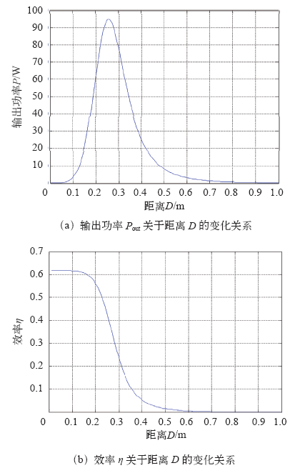 固定频率为谐振频率点615kHz,可以得到输出功率Pout和效率η关于距离D的变化关系,如图10所示。