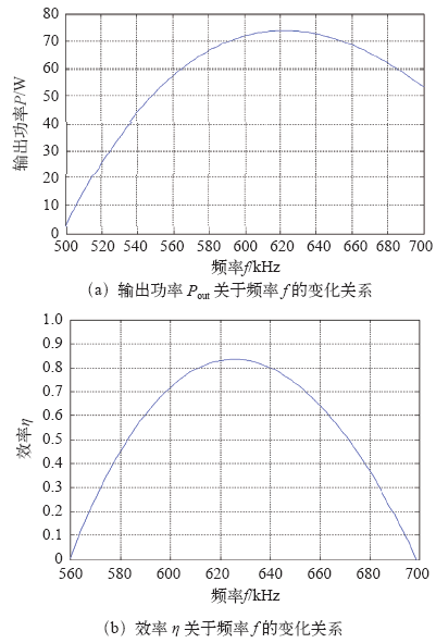 由图11可知,在在谐振频率点时,输出功率为最大值,效率为50%,达到最优匹配。