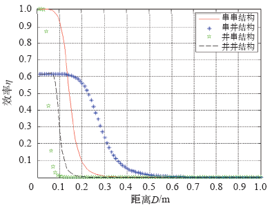(3)四种拓扑结构的传输效率在近距离下较高,但随着距离增大,传输效率急剧下降。