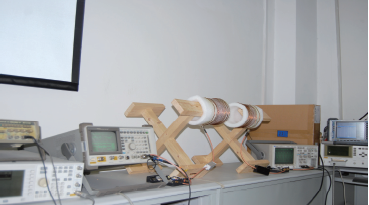 为了验证上述理论分析和仿真的正确性,本文制作了串并结构的实验模型,系统实验仪器主要包括:发射线圈、接收线圈、电路板、信号发生器、功率放大器、示波器、频谱分析仪、功率计、矢量网络分析仪和阻抗分析仪等。发射线圈和接收线圈各有14匝,采用完全相同的两个线圈,直径均为0.16m,发射端与电容构成串联电路,接收端与电容构成并联电路,并使得线圈接口与仪器接口相匹配,系统传输距离为0.21m,负载RL为50Ω,以频率为变量,观察和分析输出功率和效率的变化规律。实验实物如图17所示。