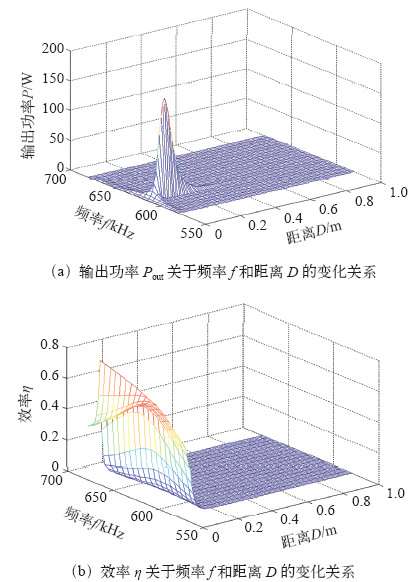 | 图12 输出功率Pout和效率η关于频率f和距离D的变化关系 |