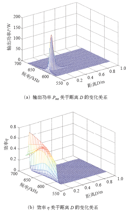 | 图13 f = 615kHz,输出功率和效率关于距离D的变化关系 |
