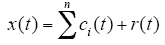 x(t)=5.08e-0.604tsin(1.068πt)+10.14e-0.708tsin(1.626πt)+15.02e-0.812tsin(3.002πt)