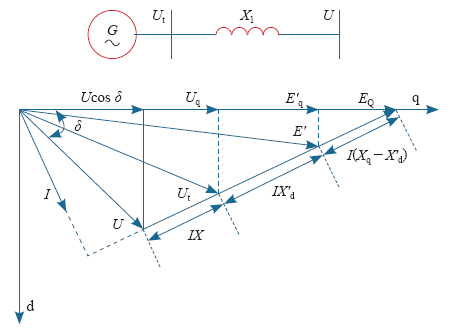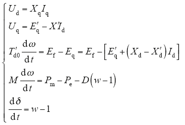根据图1,利用电磁理论和电力系统理论分析可把该系统相应发电机dq坐标标幺值数学模型表示成
