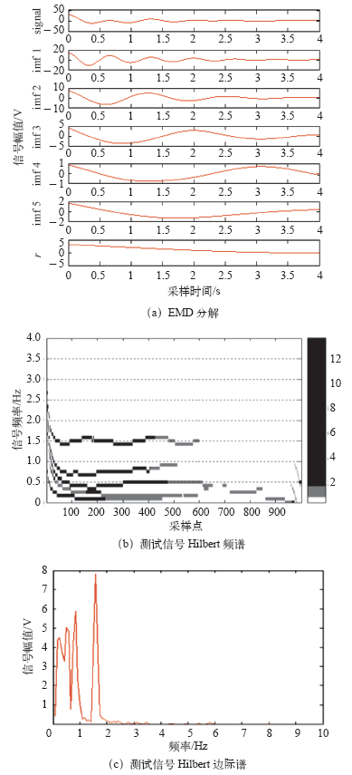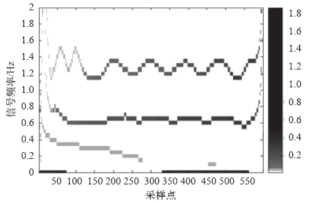 式中,a(t)为振幅;ω(t)为相位。解析信号z(t)实部即为Hilbert谱,即式(14)它是一个频率、时间和幅值的三维图像,可以反映出各振荡模式之间的相互作用。而式(15)所表示的Hilbert边际谱是Hilbert频谱在时间上的积分,其反映的是幅值随频率的变化情况,可以直观地分析出振荡信号的主振荡模式。