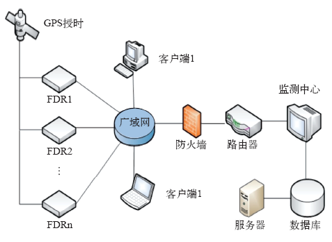 由于目前的电力系统多采用高增益的励磁调节器等,在系统受到小扰动后,发电机的输出功率、转子角速度以及电磁转矩均易发生波动,且波动幅度逐渐增大,致使系统不稳定并发生系统低频振荡,中外学者对此进行了大量研究[10,11]。目前国内外普遍采用广域监测(Wide-Area Measurement System,WAMS)技术如相量测量单元PMU来进行系统低频振荡监测与分析[12]。但PMU的广域测量系统具有设备贵、安装费用高且测试参数多等不足,于是在A.G.Phadke教授提出的PMU理论的基础上,刘奕路教授在弗吉尼亚理工期间于2000年提出了一种广域同步动态频率监测FNET技术,其结构如图8所示,思想是用研发的FDR结合GPS授时信号主要测试电网的同步时间频率等参数从而在线分析电网的扰动特性并准确快速实现系统的在线评估、预警及决策[13]。