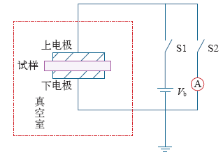 热刺激电流试验系统可分为四个部分:①直流加压系统;②真空环境控制系统;③电流测量系统;④温度监测与控制系统。试验原理示意图如图2所示。
